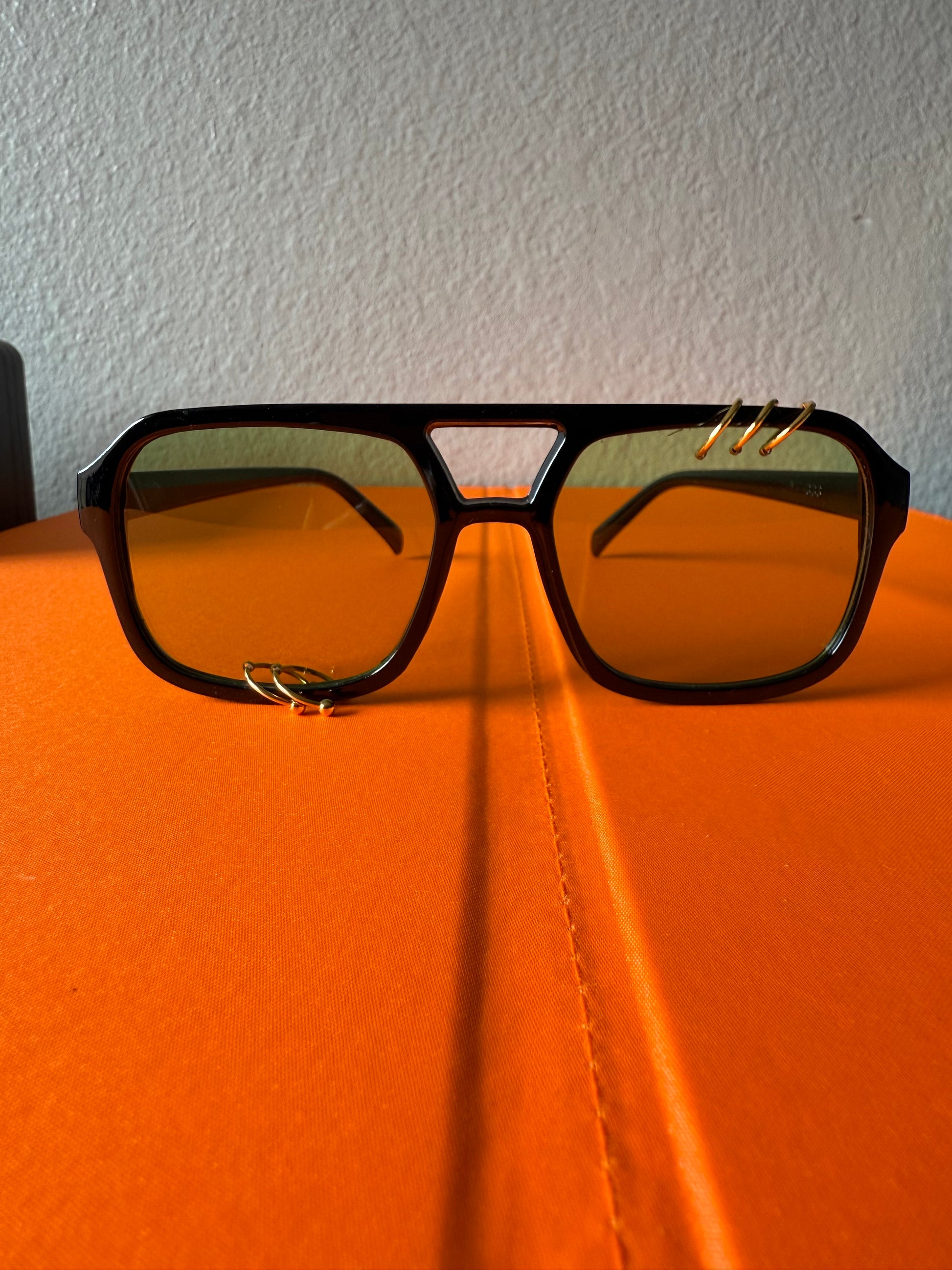 Black aviator frames, green lenses, with gold rings.
