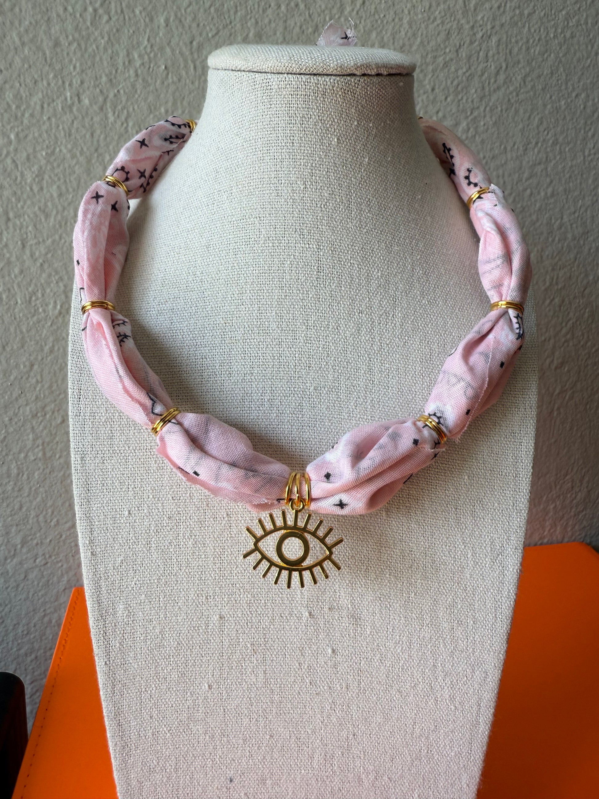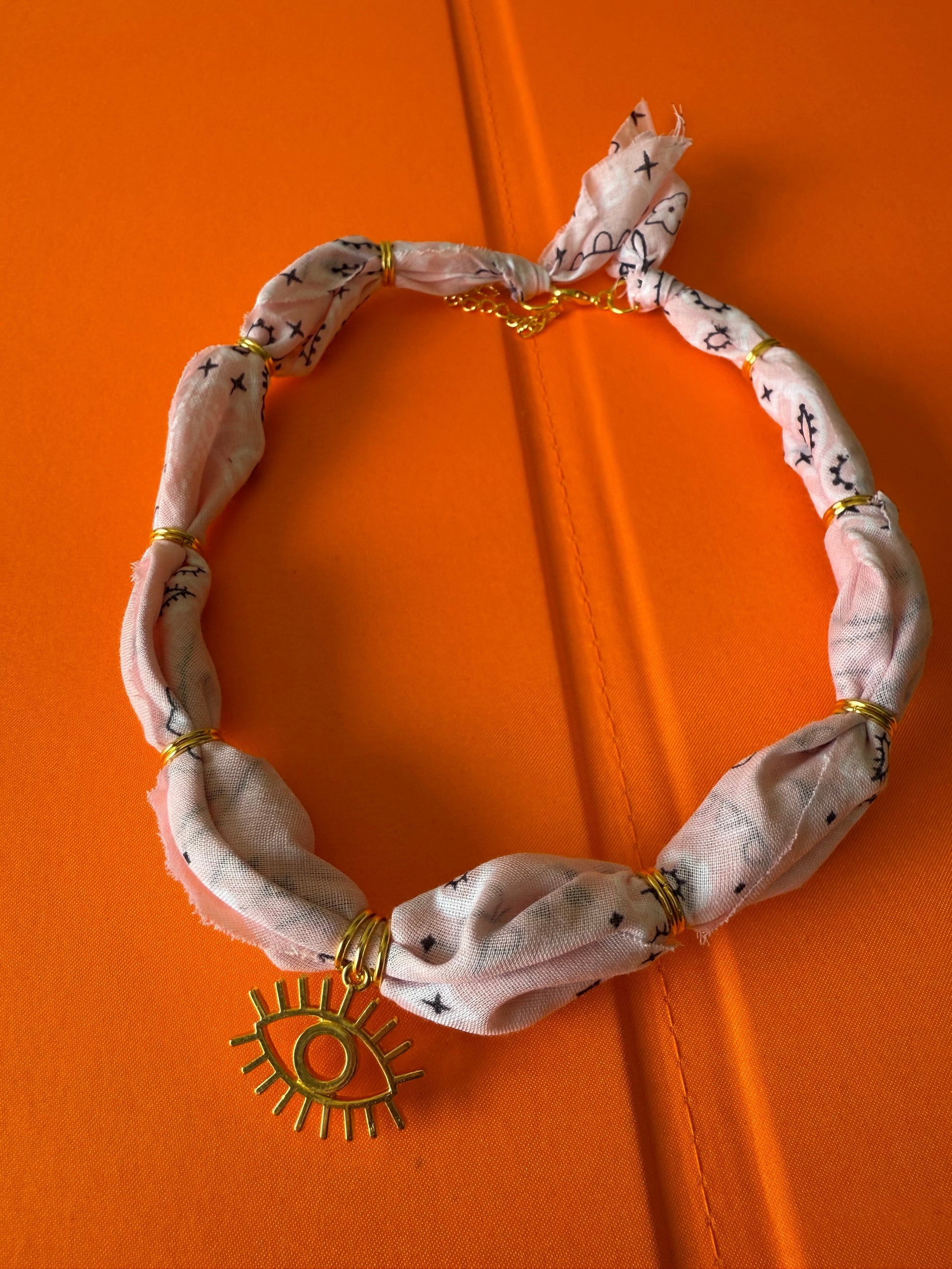 Light Pink bandana with gold findings & gold Evil Eye pendant. Approx. 17-18" plus extender.