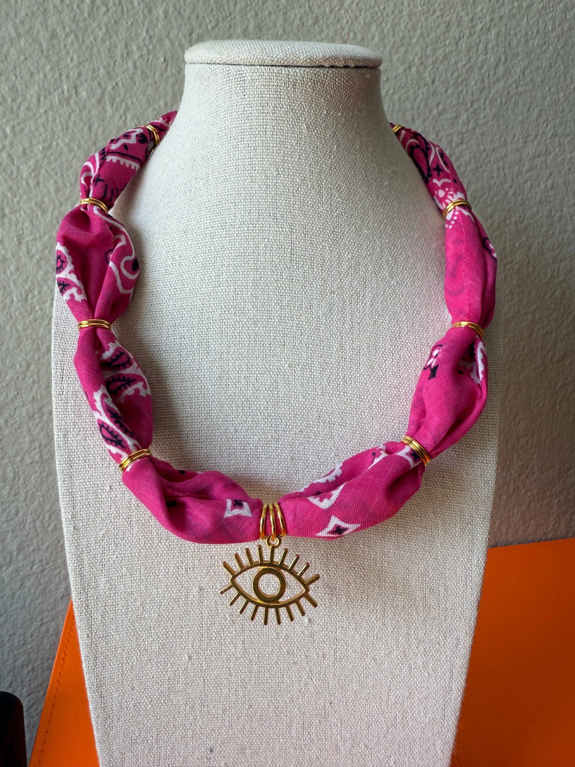 Pink bandana with gold findings & gold Evil Eye pendant. Approx. 17" plus extender.