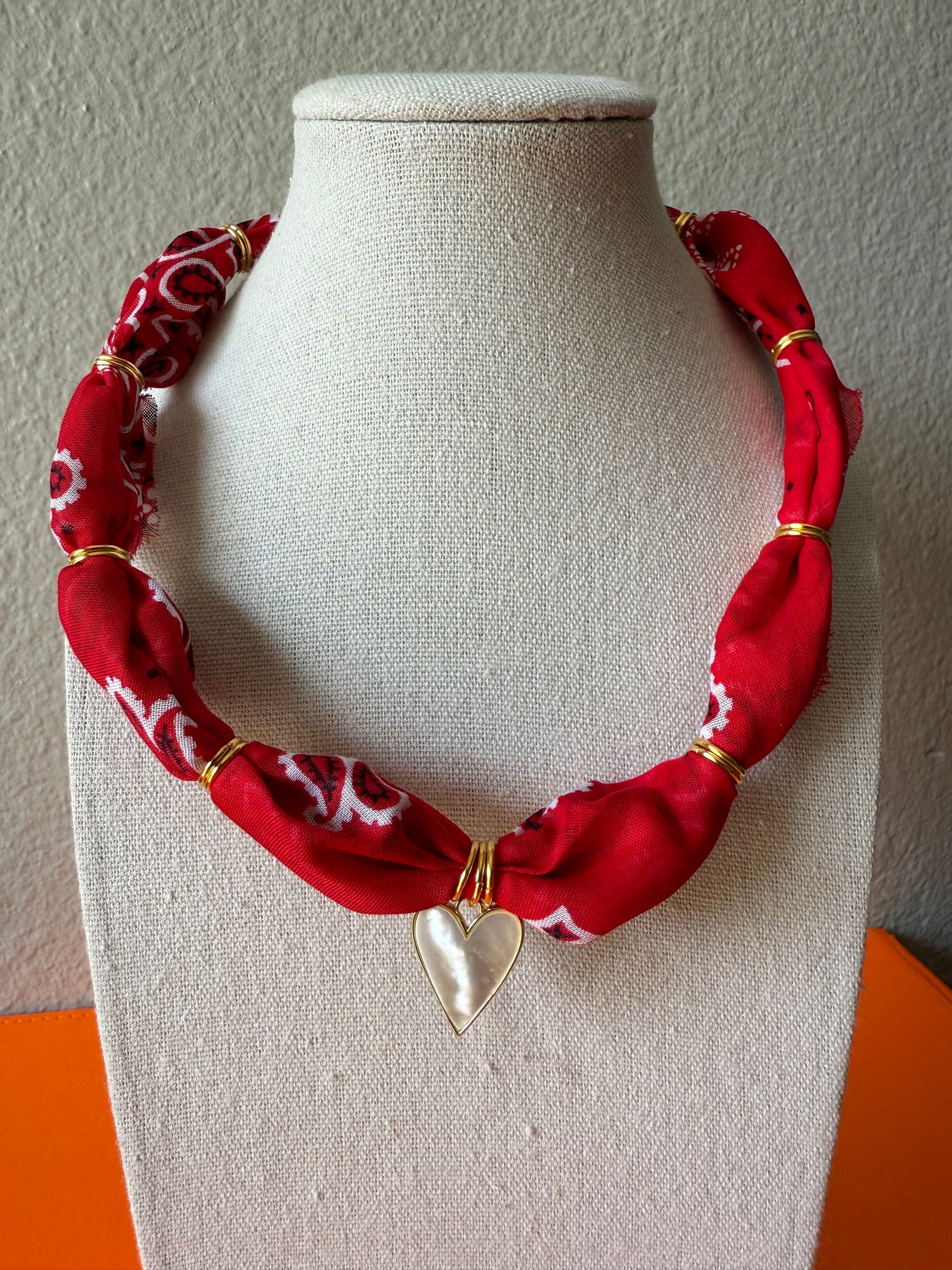 Red bandana with gold findings & gold Mother of Pearl Heart pendant. Approx. 17" plus extender.