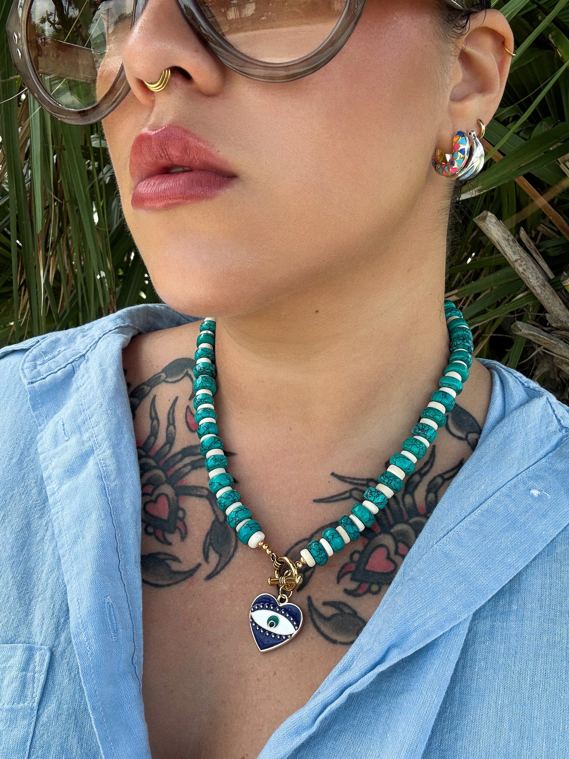 Inspired at the alleys of Mykonos, Greece. Made of turquoise-colored bone and coconut shell beads. Blue or Gold evil eye available.